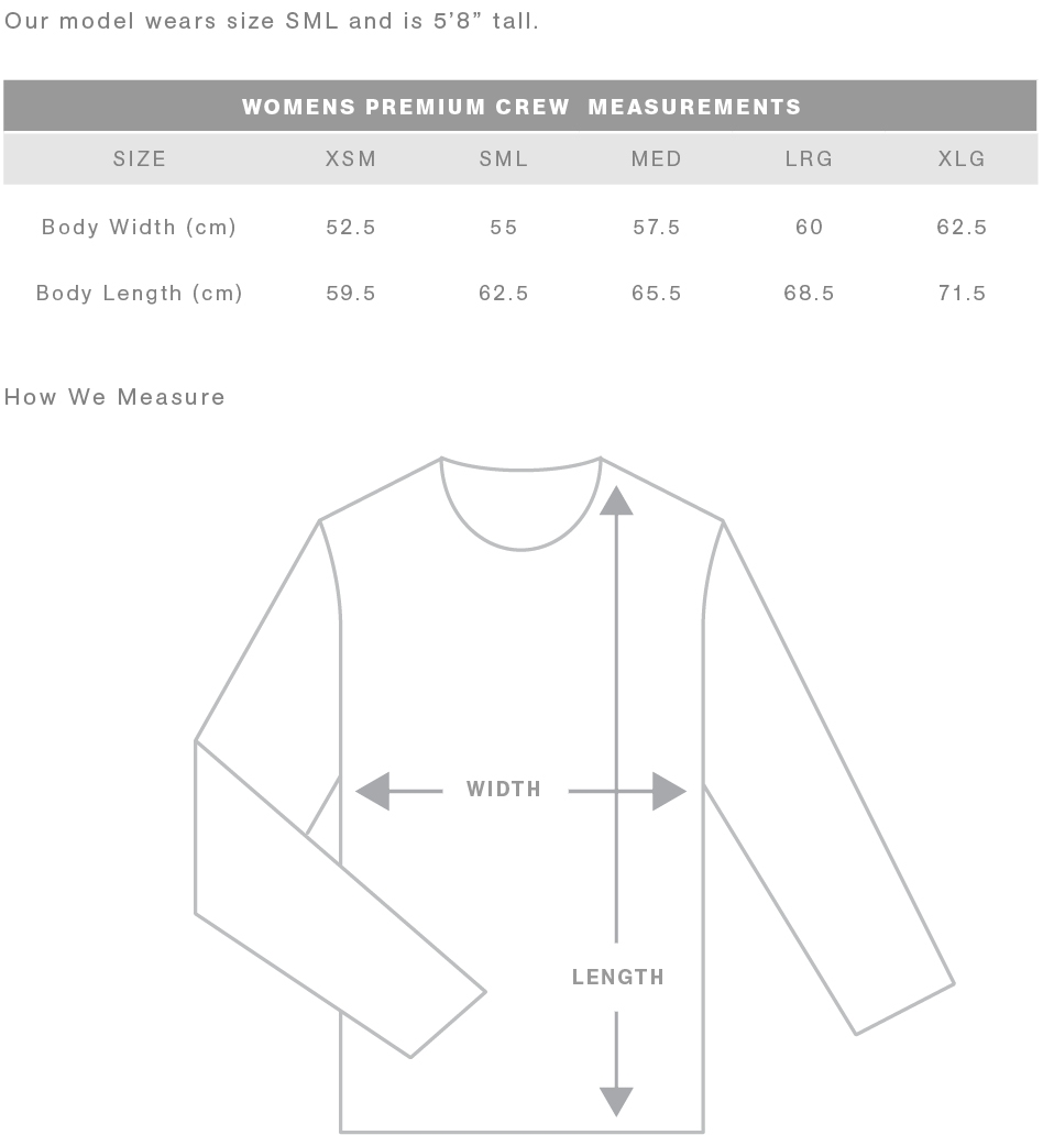 FIT: Relaxed fit - please check the size chart to avoid disappointment. Lay your own tee/sweater flat on a table, measure armpit to armpit across the chest and match to the size you feel is best. Please note measurements can vary within 2.5cm, this is within the accepted tolerance.
